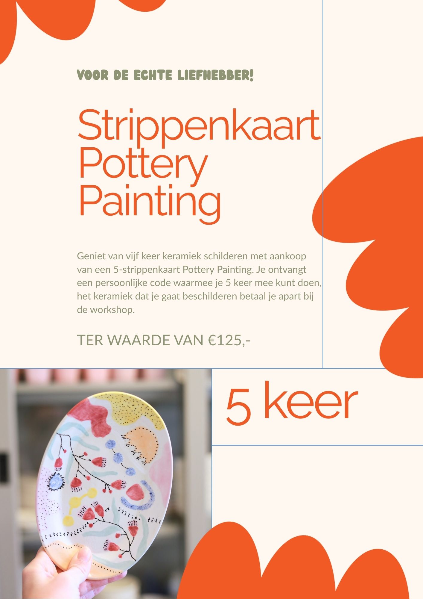Met deze 5-strippenkaart kun je vijf keer aanschuiven bij de workshop Pottery Painting en jezelf (of iemand anders) meerdere creatieve momenten cadeau doen.